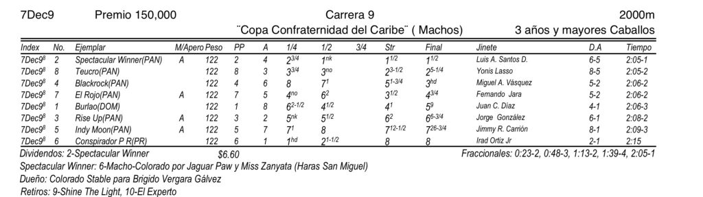 Nota Oficial.- Spectacular Winner representando a Panamá, hizo una espectacular carrera y se enfrascó con el otro nacional Teucro, para llevase los honores en la Copa Confraternidad del Caribe, en homenaje al propietario panameño Luis Shirley, patrocinado por RPC Televisión y disputado el Hipódromo Presidente Remón, en el marco de la Serie Hípica del Caribe 2025.