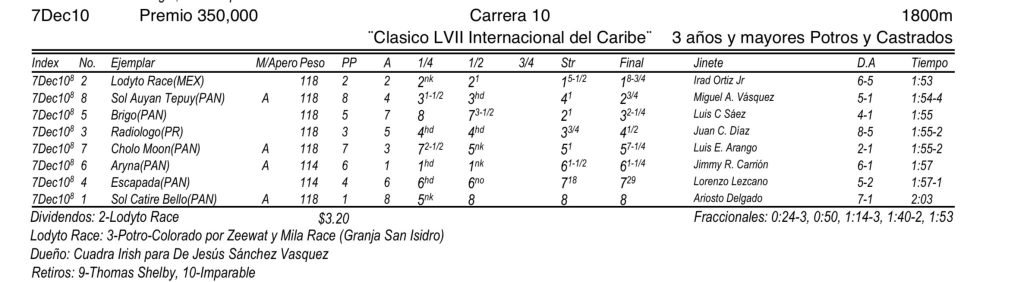 Nota Oficial.- El tresañero Lodyto Race, representante de México, ganó en un franco galope a 57ma. edición del Clásico Internacional del Caribe, con la guía del boricua Irad Ortíz Jr.