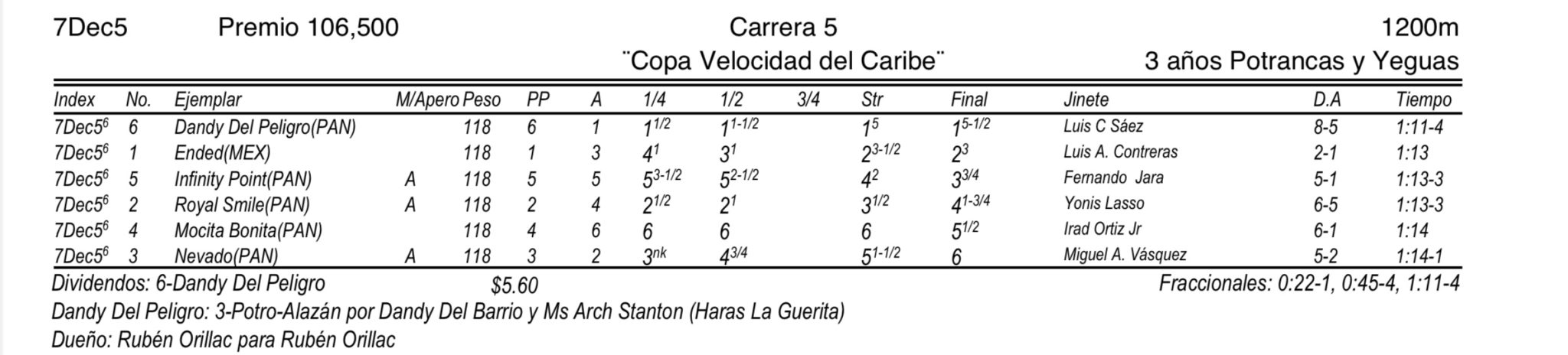 El tresañero Dandy del Peligro logró su cuarto triunfo en siete salidas a la pista con monta del panameño Luis Sáez, para los colores del Dr. Rubén Orillac, criado en Harás La Guerita. Se trata de un hijo de Dandy del Barrio en Ms Arch Stanton por Arch.