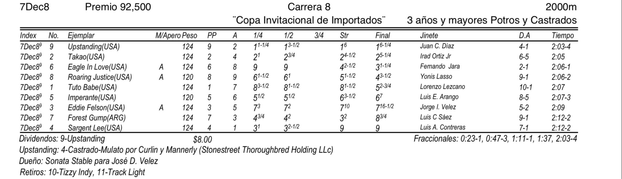 El cuatroañero Upstanding, logró su tercer triunfo de por vida, esta vez con la monta del puertorriqueño Juan Carlos Diaz, luciendo los colores del Sonata Stable. Se trata de un hijo de Curlin en Mannerly por Unbridled´s Song.
