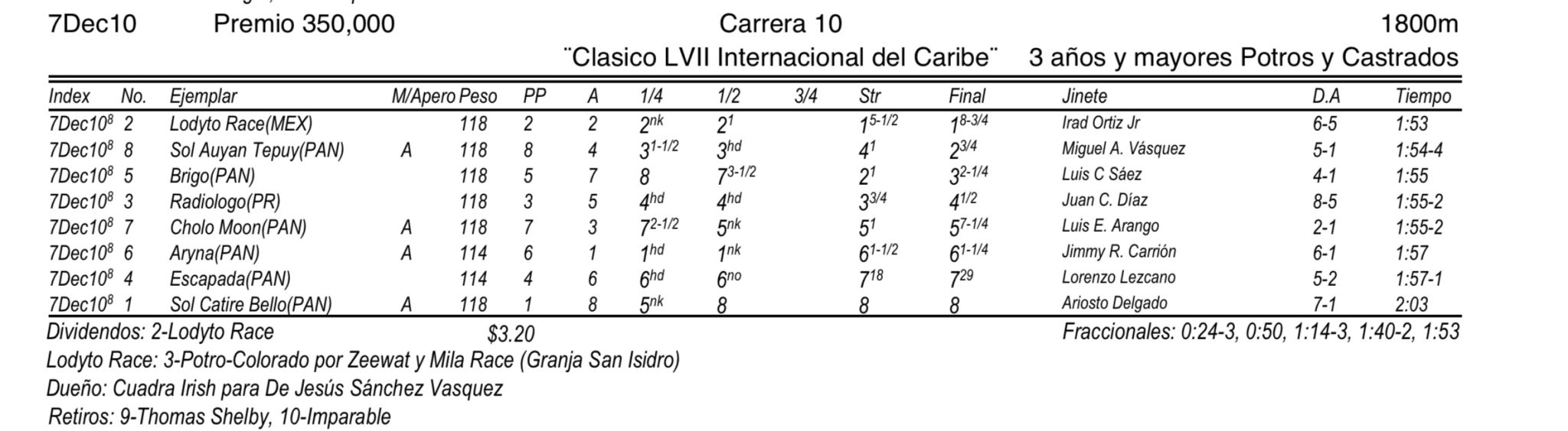 Lodyto Race logró su décima victoria en trece presentaciones, para los colores de la Cuadra Irish, entrenado por De Jesús Sánchez Vásquez, criado en la Granja San Isidro, siendo hijo de Zeewat en Mila Race por Danzing Prone Race.
