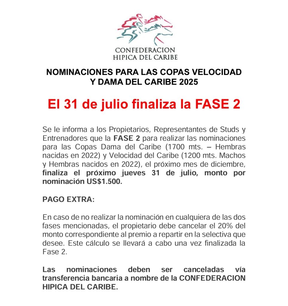 FASE 2 – NOMINACIONES SERIE HIPICA DEL CARIBE 2025 Posted on 20 mayo, 2025 por Juan Carlos Feijoo González